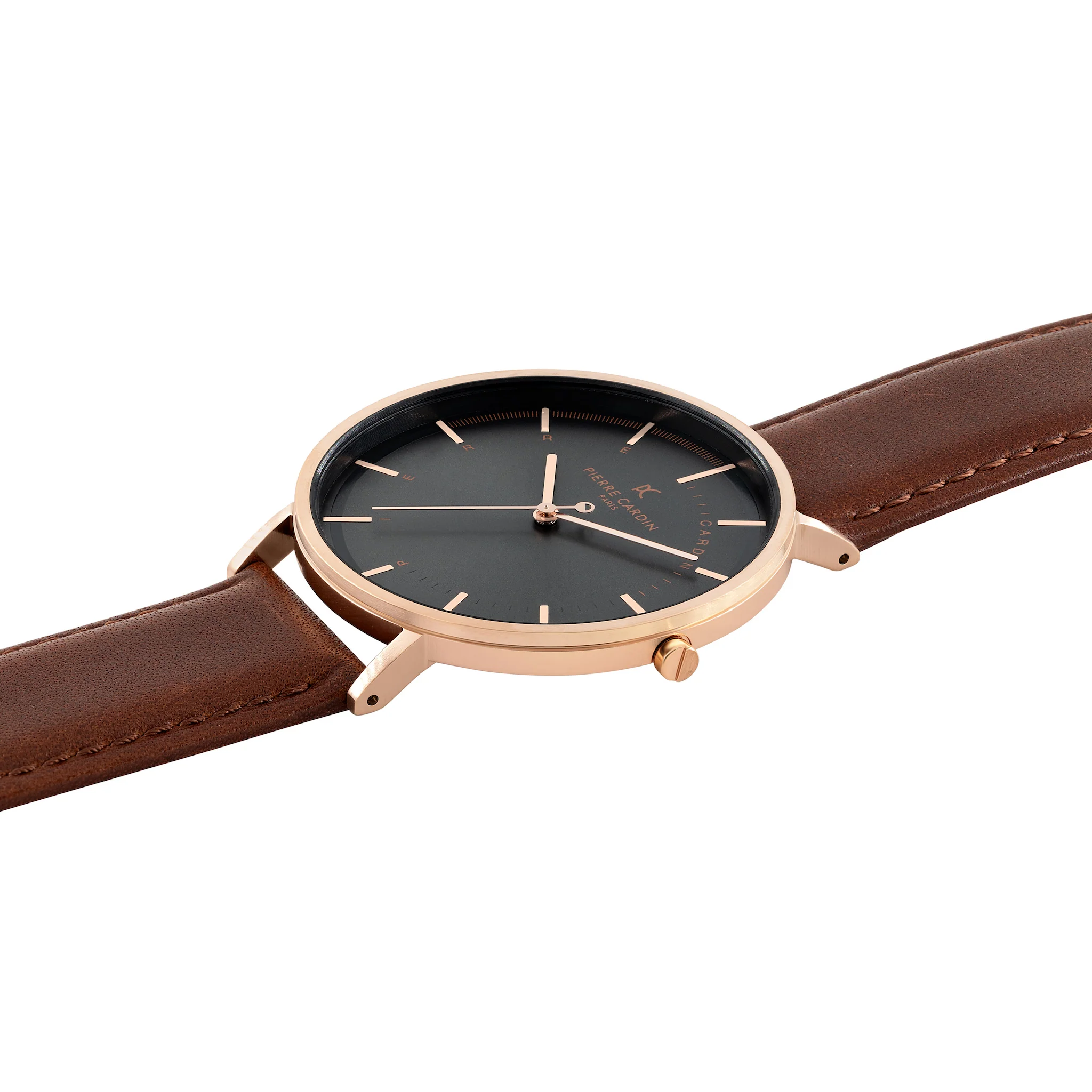 The Bonne Nouvelle leather watch for men is a statement piece that stays close to Pierre Cardin’s iconic de sign inspired by the cosmopolitan style of the Bonne Nouvelle district. The dial features minimal rose gold hands, The polished rose gold watch case offers a touch of contrast to complement a classic brown leather strap, a fine addition to all your outfits night or day.