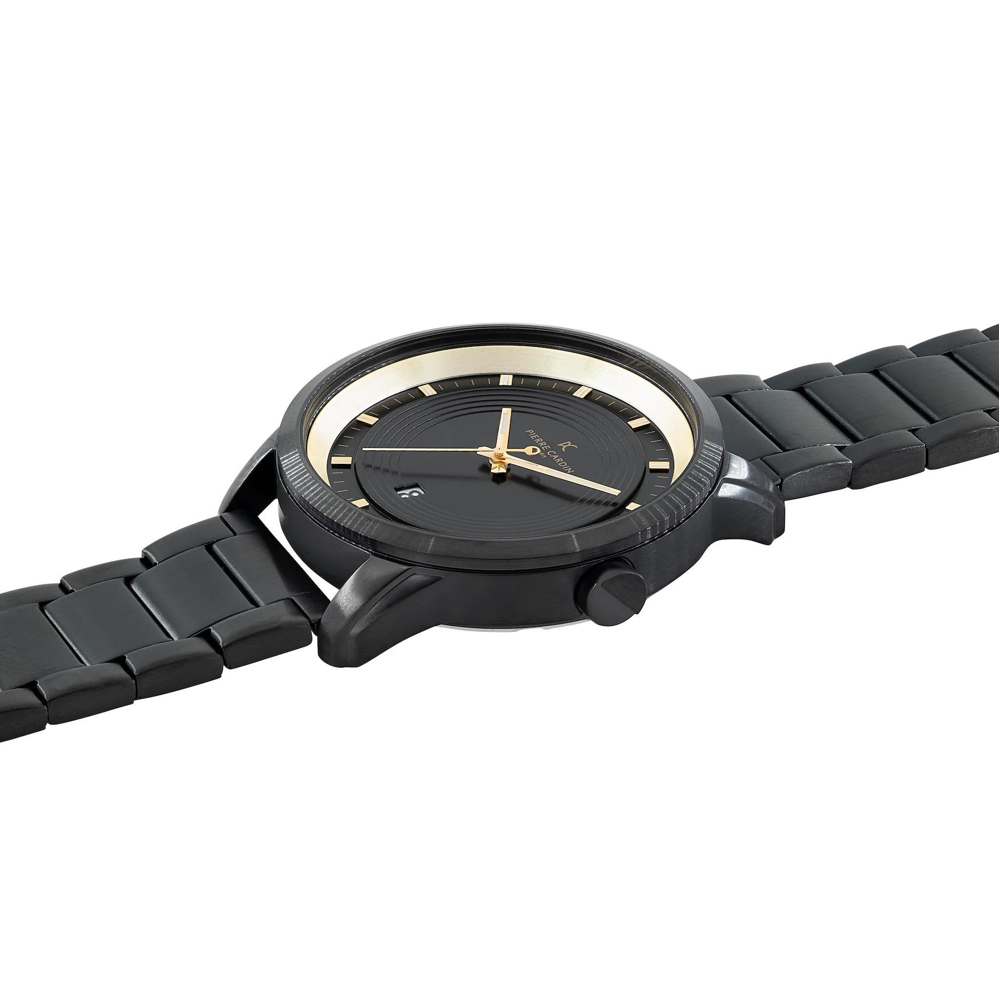 The Pierre Cardin Les Halles watch for men is a sleek and stylish timepiece with a classic design. It features a black case that adds a touch of sophistication to the watch, while the black metal link strap provides a comfortable fit. The gold detailing adds a very contrast look to the watch.