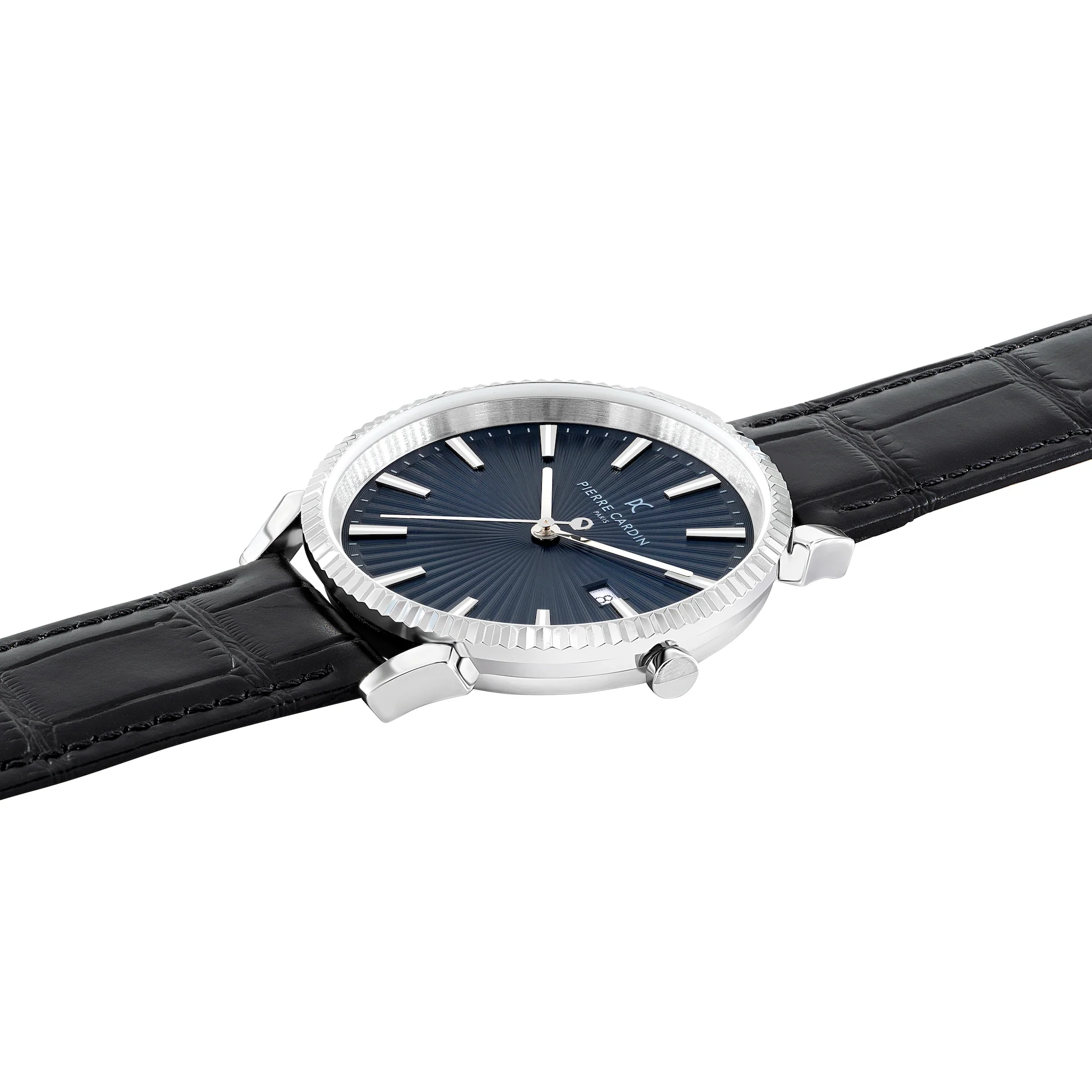 The Pigalle black leather watch is the perfect heritage timepiece for any man, with beautiful aesthetics inspired by the trendy Pigalle district as well as the iconic Pierre Cardin's heritage. This mens timepiece features a cool black genuine leather strap, a bold polished silver tone case and an eye-catching blue dial with a subtle plissée and matching silver tone watch hands.